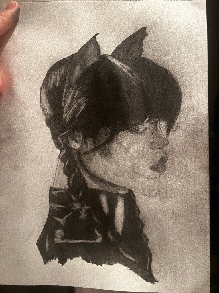 I look up to Tim Burrton as a director due to his strange style and output of Black tones in his films. I decided to draw Wednesday from the television series, with charcoal, a completely dark toned drawing to bring out the Tim Brutton effect of darkness.